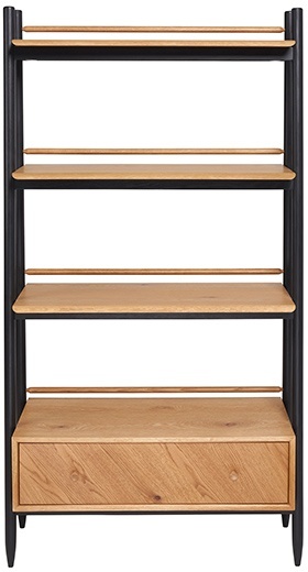 Ideal for organising and staging books, photos and other precious mementos on, this contemporary shelving unit. Three shelves and a deep drawer in brushed oak to maximise its storage capabilities all framed by the black statement legs that run up the full height.