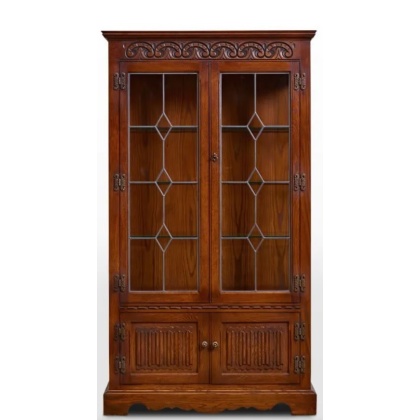 This elegant display cabinet from Old Charm showcases classic British design and superb craftsmanship. Handcrafted from rustic-grade solid oak, it features leaded light glass doors to beautifully display your prized possessions. Adjustable glass shelves and interior lighting highlight your contents, while the lower section includes carved linenfold cupboard doors...