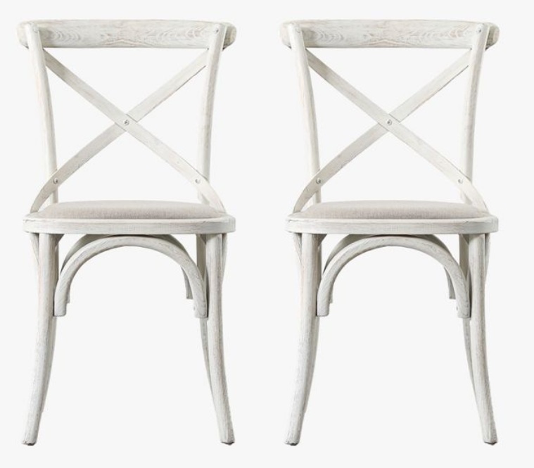A pack of 2 understated cross back chairs in a distressed white wood finish with canvas seat pads. Ideal for casual dining creating a relaxed French cafe feel in the home.