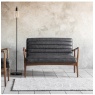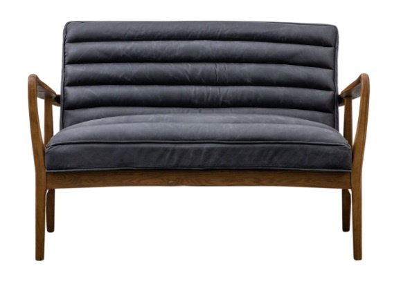 Stylish mid-century 2 seater sofa in Antique Ebony top grade leather depicting natural textures and grains, decorative horizontal channel stitched detailing and a solid oak angled frame.