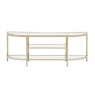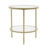 The Gallery Hudson Coffee Table in a champagne metal finish is a refined addition to any living room. Its elegant oval design features a tempered glass top and a bevelled mirrored shelf, blending modern sophistication with practical functionality. The champagne finish offers a subtle metallic sheen, perfect for creating a luxurious, light-filled atmosphere.