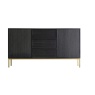 The Gallery Direct Ripple 2 Door 3 Drawer Sideboard is the perfect blend of contemporary design and luxurious storage. Crafted from solid mango wood with a bold black finish, this sideboard features a unique ripple effect on the doors and drawers. The vertical ripples on the doors and horizontal ripples on the drawers create stunning light reflections, adding depth and texture. Finished with a sleek gold-finish metal base, this piece brings a touch of glamour to your living space.