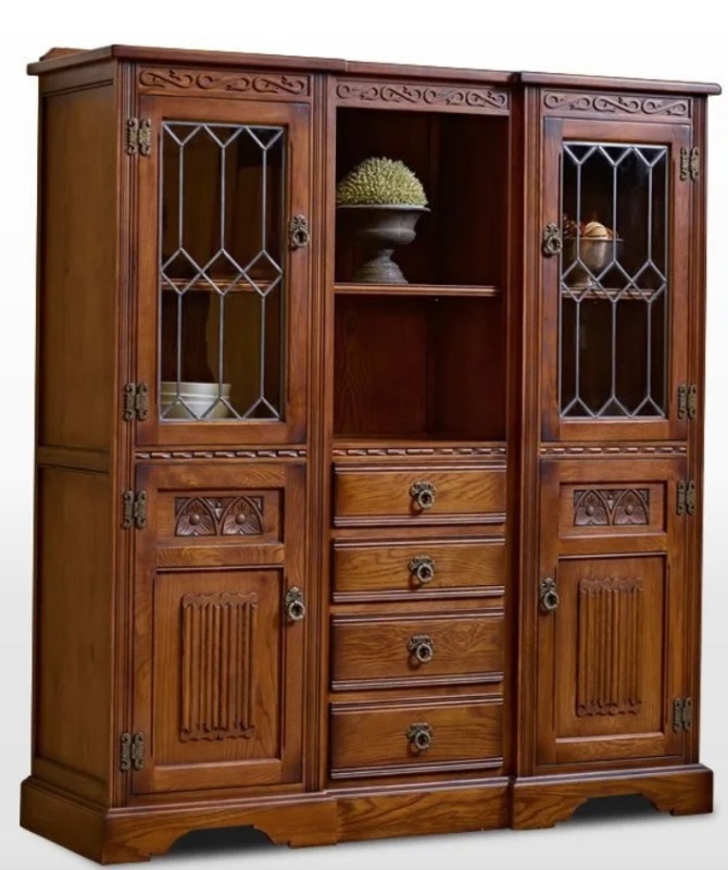 This impressive corner cabinet from Old Charm provides both display and storage in a clever, space-saving design. Handcrafted by Wood Bros Furniture from rustic-grade solid oak, it features two leaded light glass doors and interior touch lighting for your display items. The base section includes a cupboard with beautifully carved linenfold oak doors for concealed...